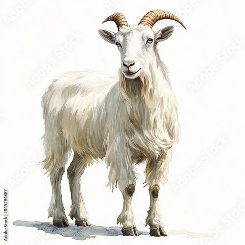 A majestic white goat with impressive horns, showcasing its unique character and charm against a plain background.