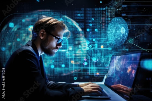 A male trader sits behind monitors with charts and data. Trading on the stock exchange. Stock Analyst