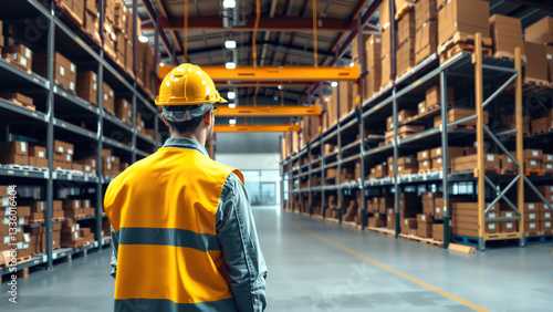 A male worker wearing a hard hat carries boxes while moving back and forth through a retail warehouse filled with shelves. The concept of labor, logistics, and supply chain management. Generative AI.