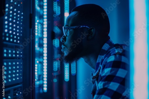 A man, bathed in blue light, concentrating intensely on servers, capturing the essence of dedication and technological prowess.