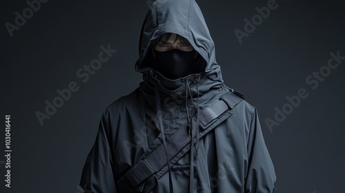 A man in a hooded jacket with a black mask on his face. He is wearing a backpack and has a black scarf around his neck. The image has a dark and mysterious mood