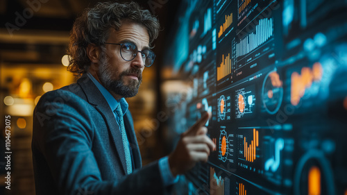 A man in a suit pointing at a computer monitor displaying graphs. Concept of importance and focus as the man directs his attention to the data displayed on the screen