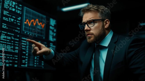 A man in a suit pointing at a computer screen with a graph on it