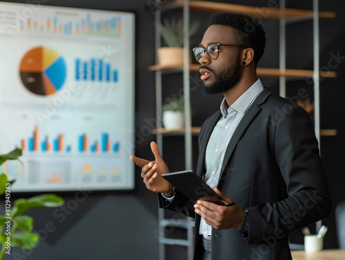 A man in a suit stands in front of a large wall of graphs and charts. He is holding a tablet in his hand and he is giving a presentation. Scene is professional and focused