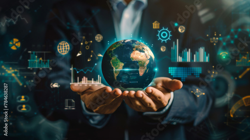 A man is holding a globe in his hand. The globe is surrounded by a lot of numbers and graphs. Concept of the importance of understanding the world and its many interconnected systems