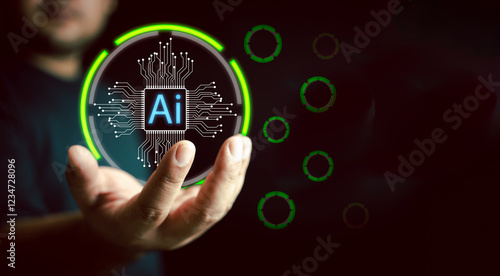 A man is holding virtual global internet connection network with AI. AI icon technology, Marketers education, research, analyze media streaming online strategies to grow their digital business.