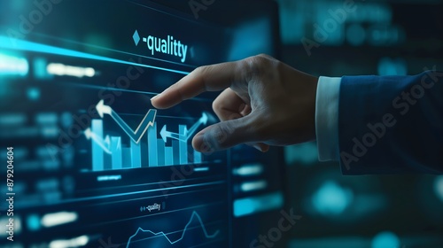A man is pointing at a graph on a computer screen that says "Quality". The graph shows a downward trend, which could indicate a decrease in quality. The man's finger is hovering over the graph.
