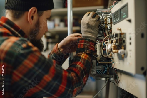 A man is seen working on an electrical device. Suitable for technology concepts