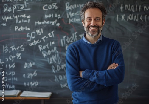 A man is smiling in front of a blackboard with mathematical equations on it