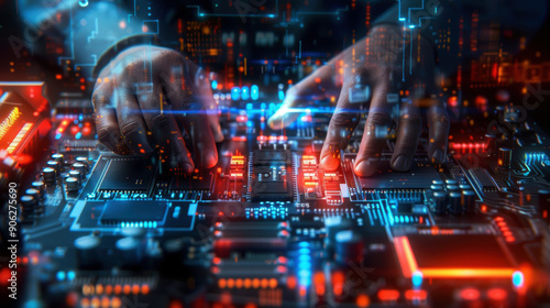 A man is working on a computer with his hands on the keyboard. The image has a futuristic and technological vibe, with the man's hands and the keyboard appearing to be part of a larger