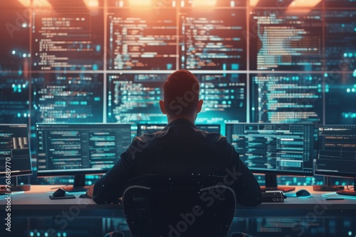 A man sits at a desk and works in front of multiple computer screens displaying various data and information, A computer programmer surrounded by multiple screens displaying codes, AI Generated