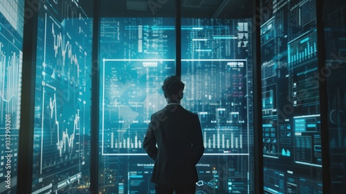 A man stands in front of a computer monitor with a lot of numbers and graphs. He is looking at the screen with a serious expression on his face. Concept of focus and concentration