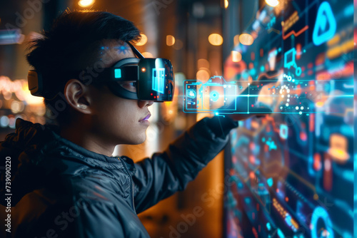 A man wearing a virtual reality headset is touching a screen