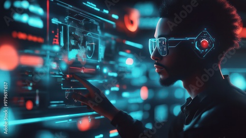 A man wearing glasses is looking at a computer screen with a finger on it