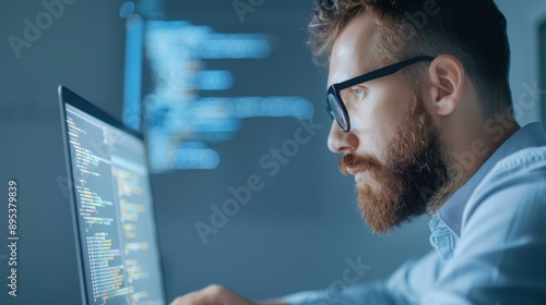 A man with glasses is working on a computer