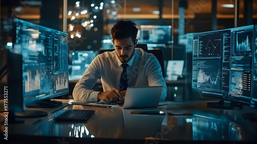 A Man Working at a Desk with Multiple Monitors Displaying Charts and Graphs