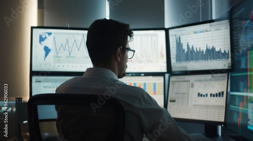 A man working in a high-tech office, analyzing data on multiple screens, indicating a busy, data-driven environment.