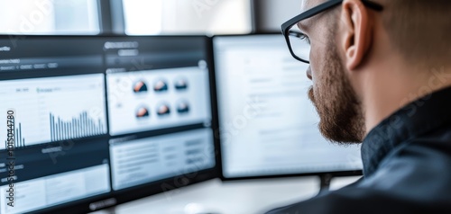 A man working intently at a computer workstation with multiple screens displaying data and analytics.