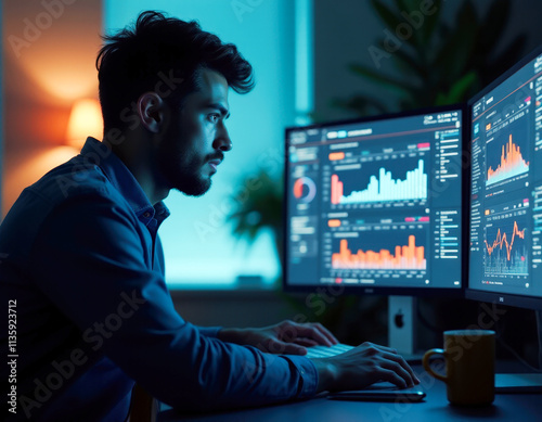 A man works on multiple computer screens, exploring data and graphs, presenting data analysis