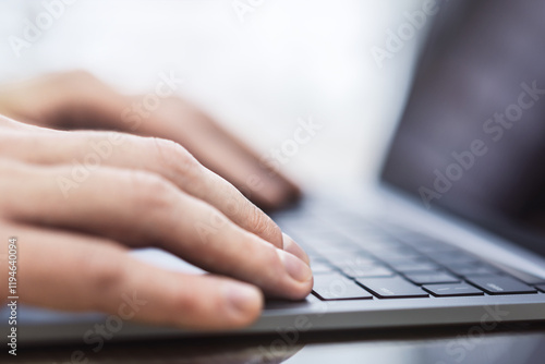 A man's hands can be seen in close detail, typing on a trendy laptop keyboard, with a blurry office setting in the background