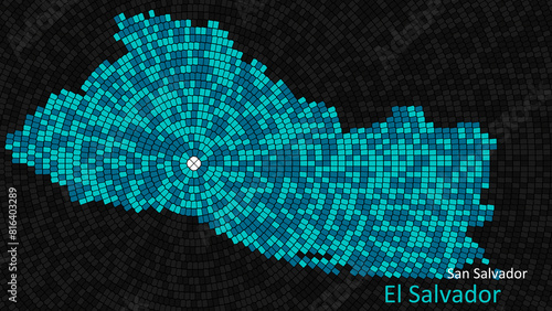 A map of El Salvador is presented as a mosaic with a dark background, and the country's borders are outlined in the shape of a colorful mosaic, centered around the capital city.