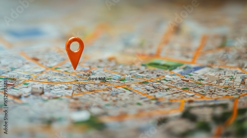 A map pin on a city map, indicating a location. The pin is orange and stands out against the cityscape.