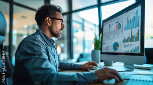 A marketer analyzing data charts and graphs on a computer screen, with detailed reports and notes nearby