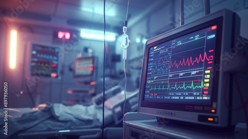 A medical monitor displaying vital signs in a hospital room with a blurred bed in the background.