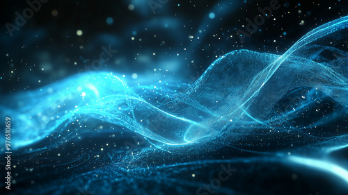 A mesmerizing abstract digital background with flowing blue waves and sparkling particles