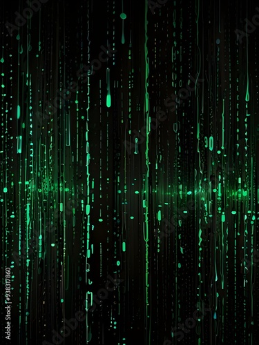 A mesmerizing cascade of luminescent green data streams flows downward in a shimmering curtain, suspended against a rich, inky black background, evoking a sense of futuristic intensity