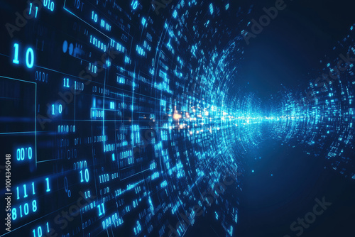 A mesmerizing digital tunnel of blue binary code swirling through space and time, creating a cosmic effect of motion and depth. Generative AI