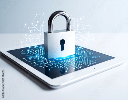 A metallic padlock sits atop a tablet computer, with circuit board design, symbolizing digital security.