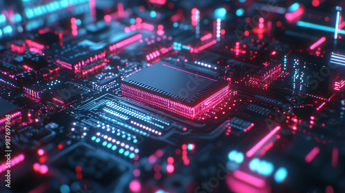A microchip generating an augmented reality interface. with colorful circuits forming interactive elements.