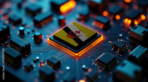 A microprocessor with the Brunei flag is embedded on a circuit board, highlighted by glowing lights, showcasing influence in global semiconductor and computing technology.