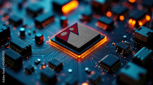 A microprocessor with the Nepal flag is embedded on a circuit board, highlighted by glowing lights, showcasing influence in global semiconductor and computing technology.
