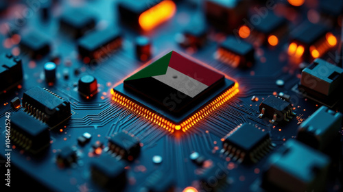 A microprocessor with the Sudan flag is embedded on a circuit board, highlighted by glowing lights, showcasing influence in global semiconductor and computing technology.