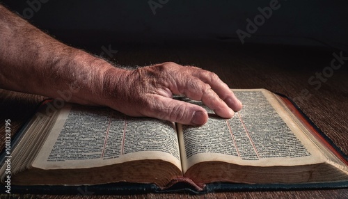 A middle-aged hand resting flat on an open Bible