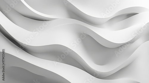 A minimalist 3D wave design in grayscale, with soft, undulating curves casting shadows and creating a subtle yet dynamic abstract composition on a clean white backdrop.