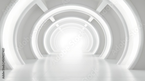 A modern and futuristic white circular tunnel with bright light at the end creating a sci-fi atmosphere.