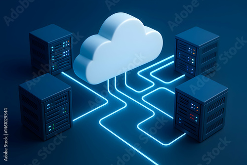A modern cloud computing concept visualized with server graphics and connecting lines.