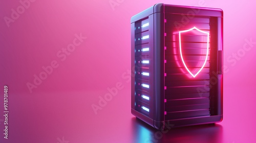 A modern computer case with neon lighting and a shield design, symbolizing technology and security in a vibrant setting.