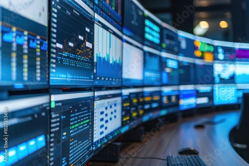 A modern control room with multiple computer screens displaying data and graphs. Perfect for depicting technology and data analysis scenes.