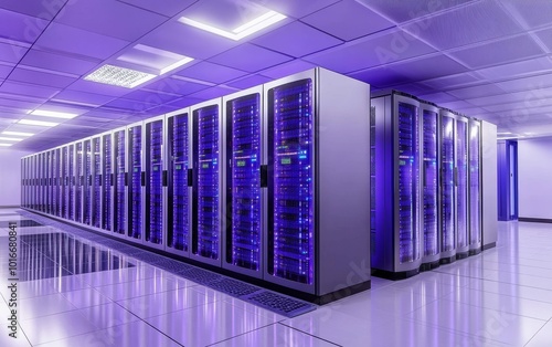 A modern data center featuring rows of servers illuminated with blue lighting, emphasizing technology and infrastructure.