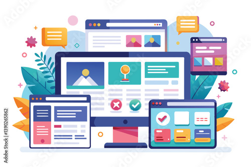 A modern desktop computer with open web browser tabs displaying text, images, and graphics, set against a backdrop of stylized foliage and digital elements.
