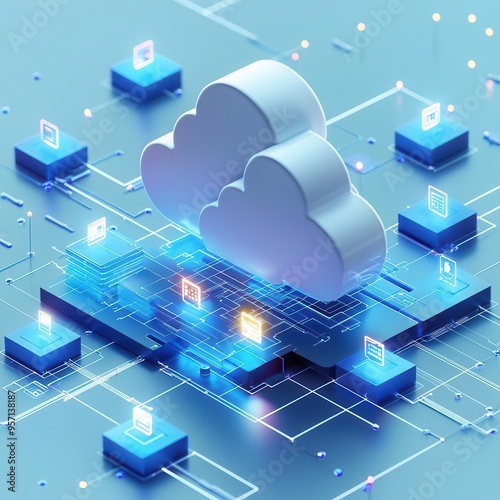 A modern digital cloud computing concept with glowing elements, representing data storage and network connectivity.