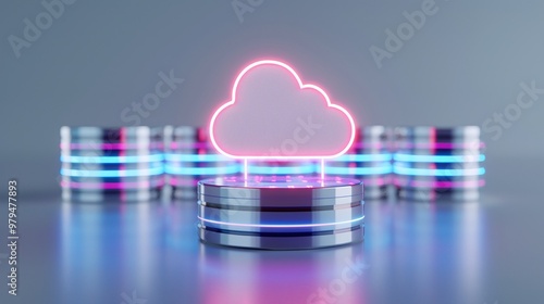 A modern digital cloud icon glowing above metallic databases, symbolizing cloud computing and data storage technology.