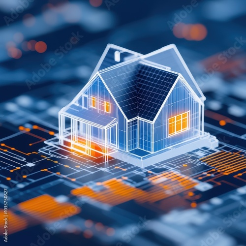 A modern digital house design showcased on a tech-inspired background, illustrating the fusion of architecture and digital innovation in real estate.