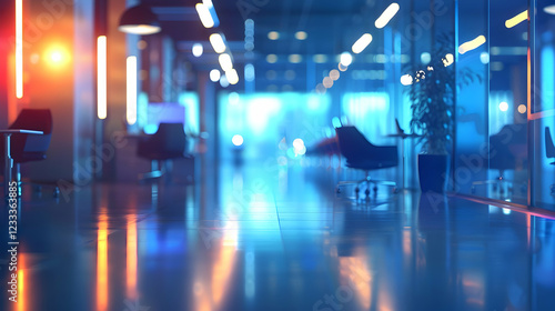 A modern office space with vibrant lighting and reflections on the floor.