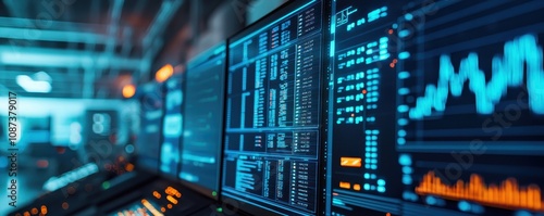 A modern trading setup featuring multiple screens displaying stock market data and analytics in a tech-savvy environment.