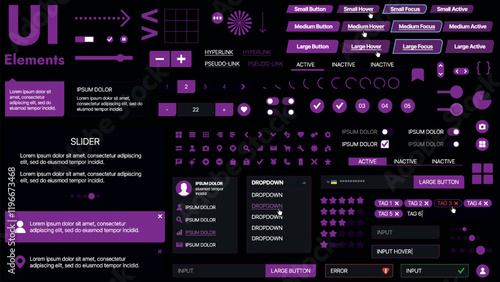 A modern UI kit featuring a collection of buttons, icons, navigation menus, and responsive design elements. Includes login forms, media players, search bars, and calendars, ideal for apps, websites